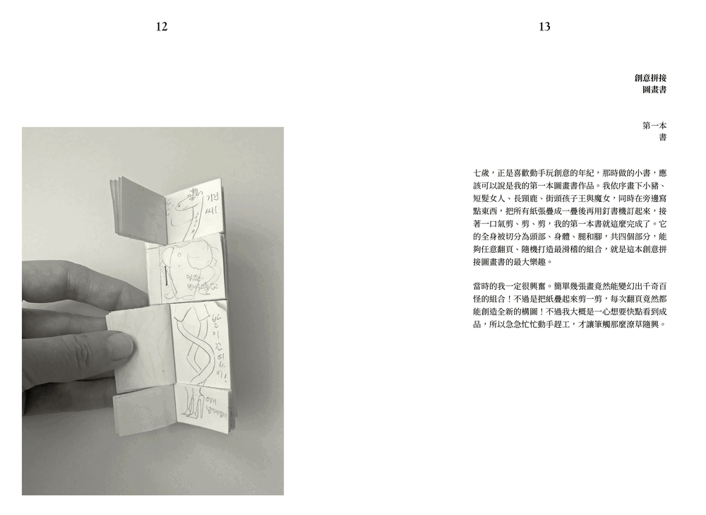 但也正因如此,她重新定義了「成就感」:只要能在時間的縫隙裡完成比預期「多一點點」的工作,就足以滿足。她沒有時間陷入創作低潮,因為對她而言,創作本身就是奢侈,一旦有時間就要抓緊多畫一些。而孩子們的純真與隨手創作也時常啟發她,例如,兒子小山因手指力氣不足,做出的小書歪歪扭扭,竟讓她生出靈感,創作出《翻開這本小小的書》。