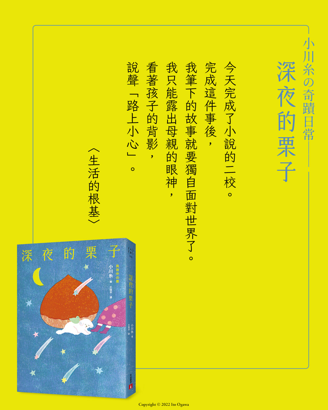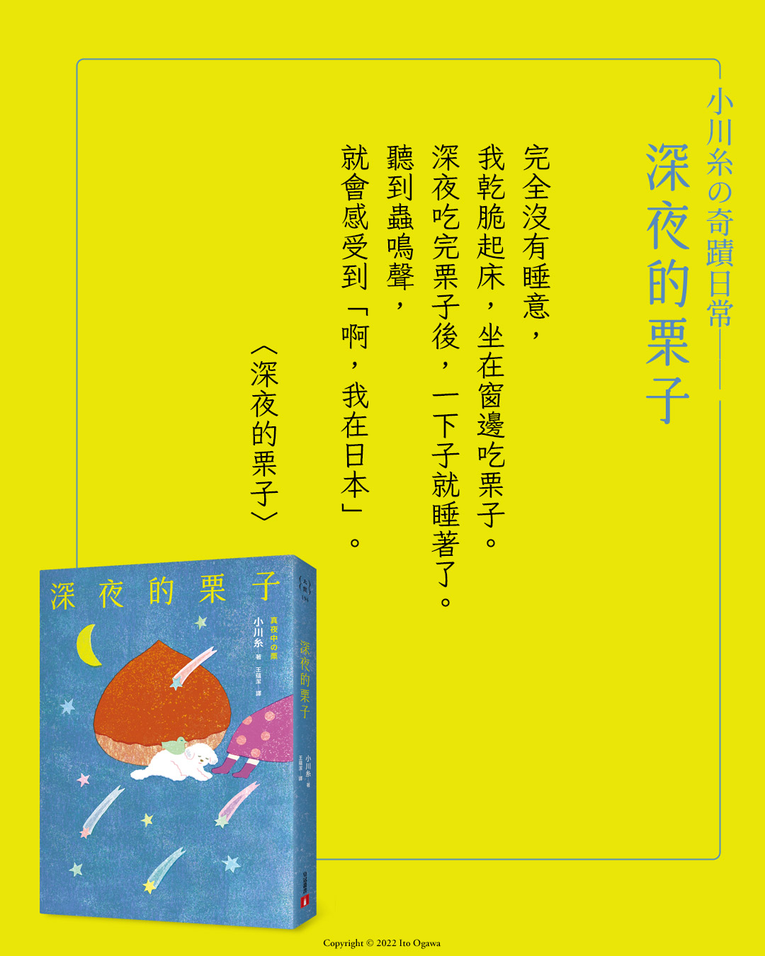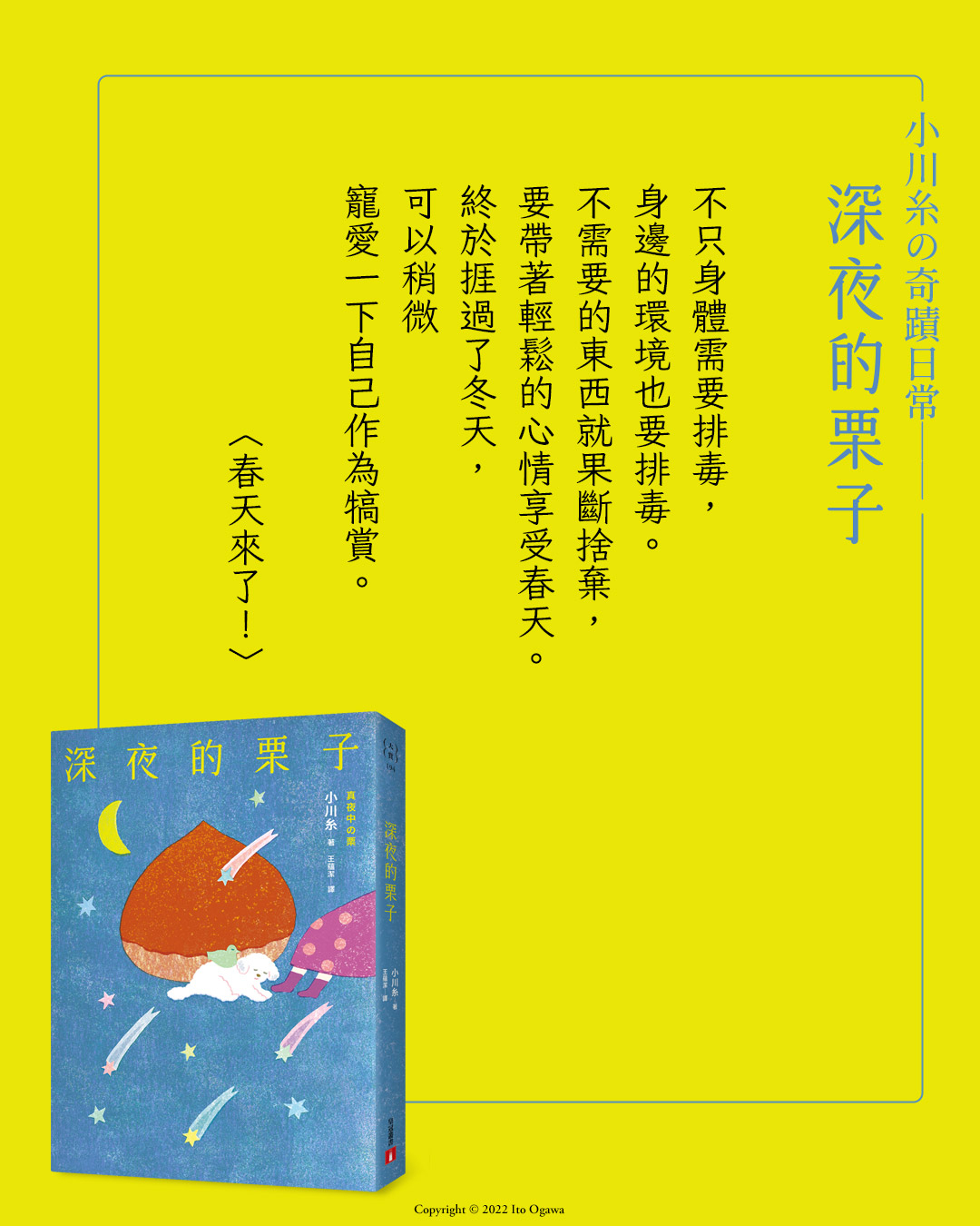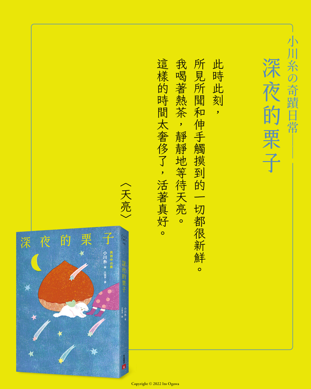 一句話、一本書、一道菜、一個器皿,一部電影,或是一段人情,記錄不分大小,只關乎心情,比起小說,她的隨筆更能讓我接近真實的小川糸,從《山茶文具店》、《喋喋喃喃》,到這一本《深夜的栗子》,在她的書裡,沒有跌宕起伏情節,卻永遠能讀到四季流轉中,如春日溪水般清澈見底的日常感受,和人與人間最樸素的情感連結,尤其當讀到她寫著:「即使如此,我想要接納自己真實的樣貌,如同從內心雜亂無序堆疊的一塊塊情感瓦礫堆之間,追尋著陽光而冒出地表的花一樣,我也想要朝著有光的方向活下去。」更讓閱讀的我,也宛如書中主角般,緩慢與自己的過去達成和解。