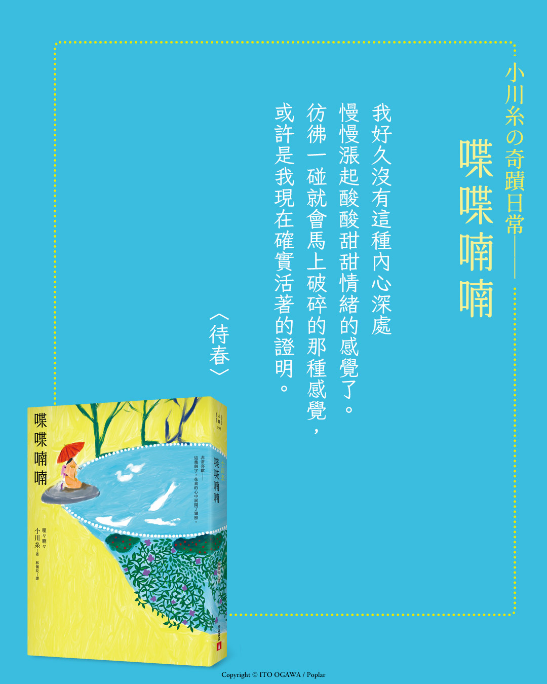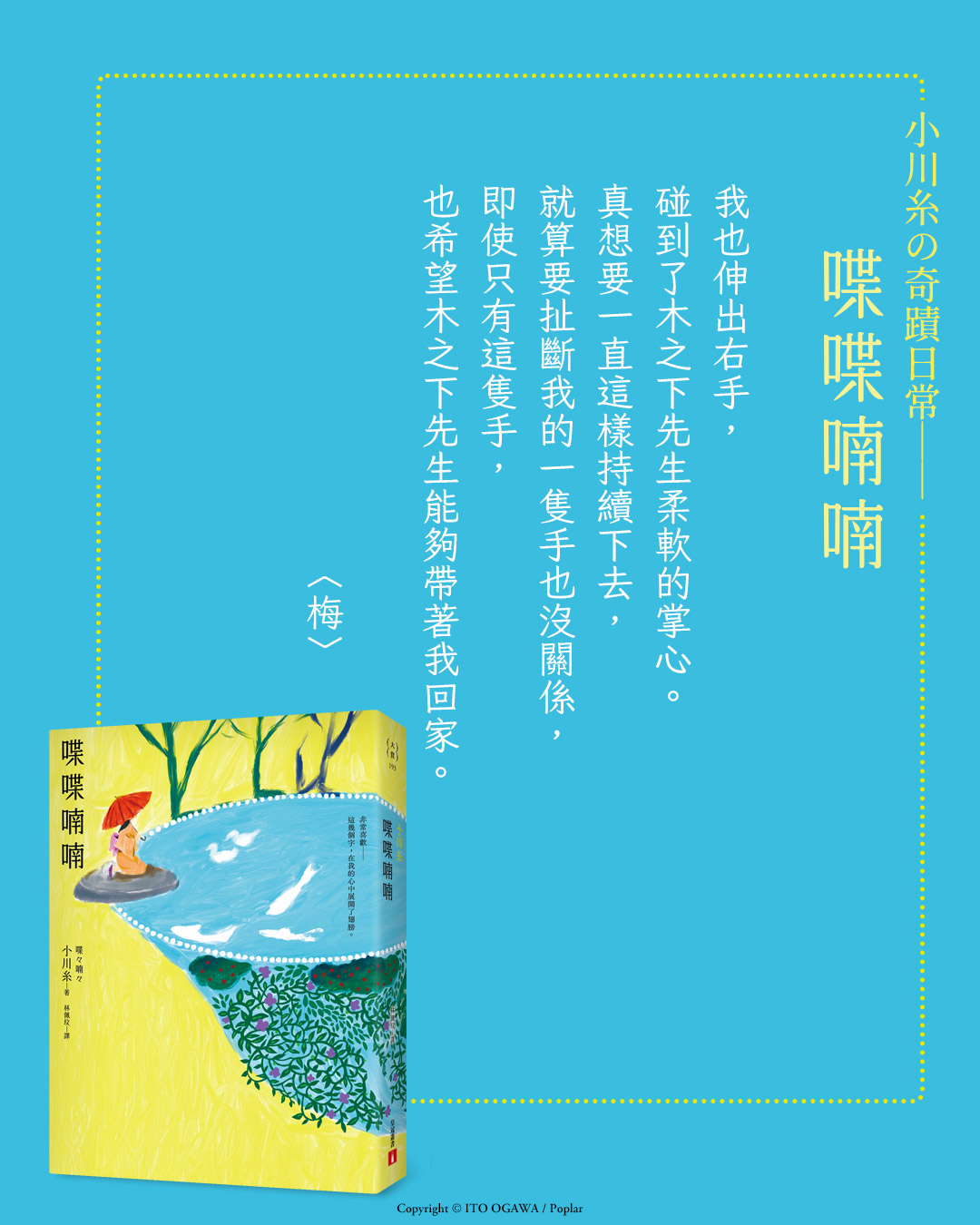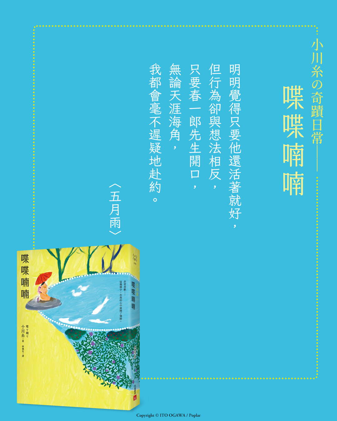 人生行過漫長數十年,多少無法向人訴說,令自己懊悔愧疚的重擔要背負,「一如既往地過日子,才是最為有力的抵抗。」但這是小川糸對苦難的看法。未見抱怨之語,即使是鬱悶的事,由她娓娓道來後,都能轉變成一股溫柔堅定的無名力量,她的文字像一條潺潺溪流,順滑流進生活空隙裡,讀後感覺淡淡的,心被打濕的痕跡卻很清晰,不停提醒我們,寧靜感受時光的心依然在,我想,這就是小川糸的魅力。