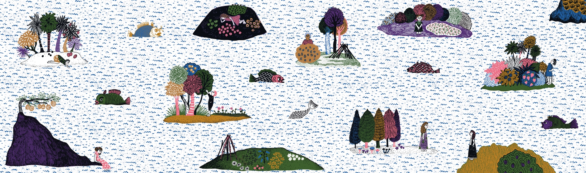 最後一點:《一念之島》是需要用雙手翻開的書。在引向他島一幕和最後一幕——孩子們在島上相互握手與擁抱——之間,有著數層折頁,以手將之攤開,會有240公分的長度,展現海洋上遍佈諸島的全景。獨特裝幀設計讓我們得以脫離自我視角,給出延展視野:看到各島嶼上不同的企盼,更可以看到有孩子正以不同的方式嘗試脫離孤島。在眼睛游移於全景兩端的溫紅海洋島嶼之際,我們會心想如何從此端到彼端,如何串連起這一系列的孤島?一個建議:我們可以和孩子一起大膽地拿起筆,在這片特意留出白底的海洋上,畫出連接這些島嶼與他人的各種方式。相信在以手握筆,構思描繪之際,我們都將找到脫困孤島的解方。