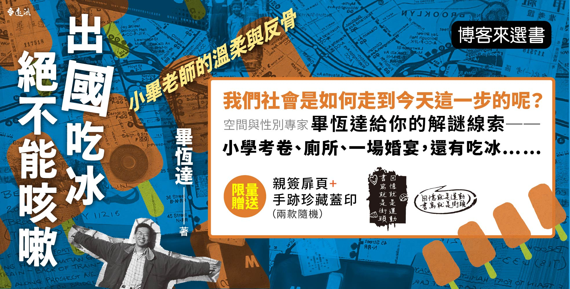 名流以傳記為自己建碑立像,崇高壯觀,遊人只能遠遠瞻仰。畢恆達自傳《出國吃冰絕不能咳嗽:小畢老師的溫柔與反骨》卻悍然袒露男性不可告人的私密感受,打破種種「男人不可以」。在「哭什麼哭,沒出息」的傳統斥責下,為挫敗與卑屈等非法感受,贏得公開傾訴的正當性,也就拯救了每個讀者身上不正確、「此風不可長」羞於啟齒的部分。