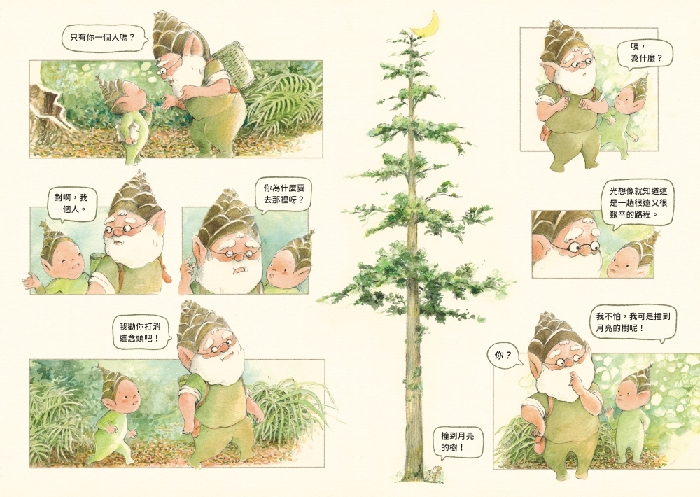 資深繪本創作者張哲銘的作品表現非常多元,《撞到月亮的樹》兩冊又有新的突破,形式表現介於繪本、漫畫、圖像小說之間,難以定義也無需定義。作者以一位宛如小精靈的擬人毬果為主角,在台灣的山林中展開一段壯旅,過程中相遇的盡是台灣本地生物,如枯葉蝶、螢火蟲、黑冠麻鷺等,有驚險也有笑料。工筆繪製的風景寫實也寫意,讓讀者得以隨著故事的敘事路線前進,一窺台灣高山林間晝夜不同的表情,感受到氤氳的霧氣從紙頁之間逸散出來。這兩冊的系列之作,內容結合奇幻故事與自然科普,流暢好看的故事加上純熟細膩的圖畫,極有跨域的潛力,若發展為動畫,想必精采可期。
