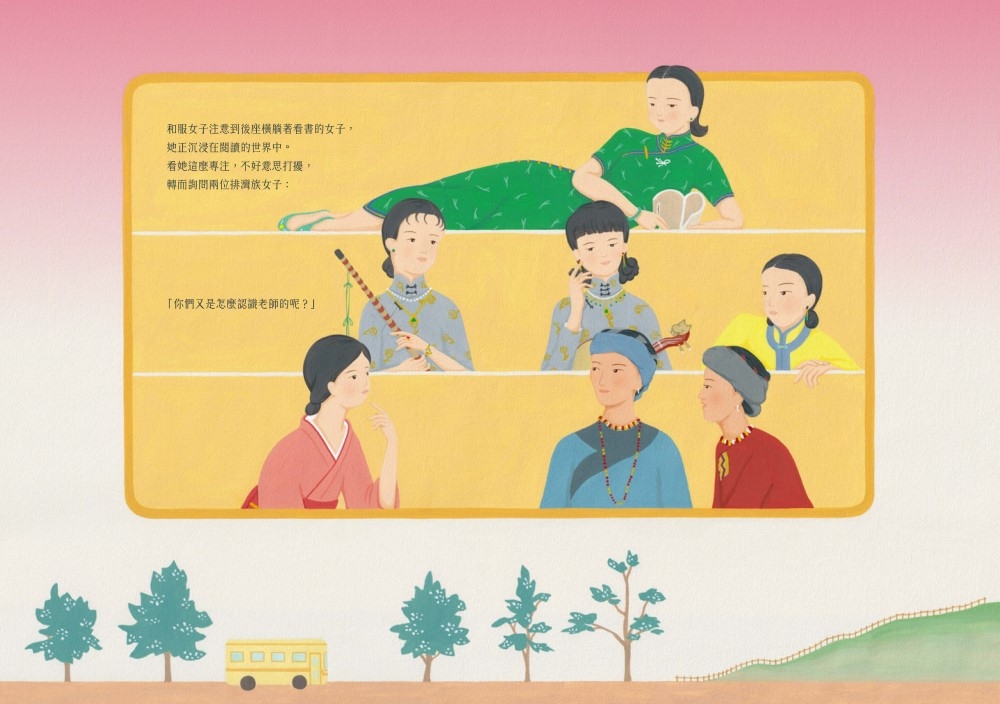 人物傳記繪本總是平鋪直敘的多,此書別出心裁,將陳進放在最後壓軸現身,且僅一頁,已是人生長旅後段的模樣,陳進不看讀者,亦不與書中其他角色互動,只是伏地靜靜畫觀音,讀者等於和書中眾女子同看陳進沉浸「畫圖中」,宛如一直以來,人們觀看她的畫作一般。另一特殊之處是全書不以第三人在畫面之外敘述,而是讓陳進歷來畫作中的女子談論她,讀者聽著閒聊雜談,「看見」不同時代底下的畫家。此書的圖像語言令人讚嘆,表現出一種極致內斂的燦爛,溫婉如人,精彩如畫家一生的創作。主要的頁面都有一只大框在畫面正中央,如車窗、畫框、虛實的分界;畫中亦有許多象徵時代的符號,讀者可一一感受、拆解,永無止盡的觀看。