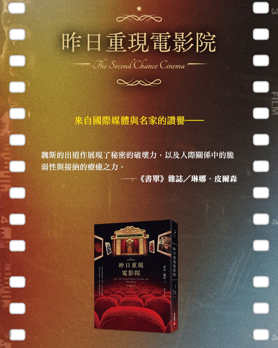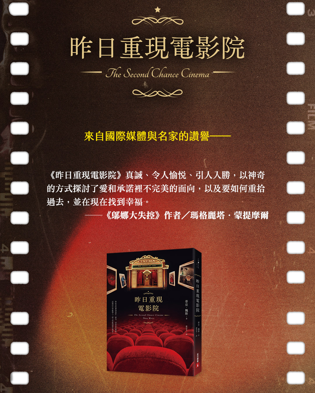 雖說《昨日重現電影院》是一部長篇小說,然我認為其中有意思的地方在於,小說記錄的是一男一女的過往,在讀完他倆的人生以後,重新翻頁至任何一段,都好像是一場時空跳躍──嬰兒時期,青春時光,某一場劇烈的爭吵,與另一個人愛得最烈的那一刻……如是從任何一章節翻開來讀,看起來都是一個微型的故事縮影,當作短篇來看都不為過。有些美好的時刻,會希望故事就停在那個最動人的點上,有些墜入深淵的時候,又會以為生命停滯在此地,不可能往前轉動了。